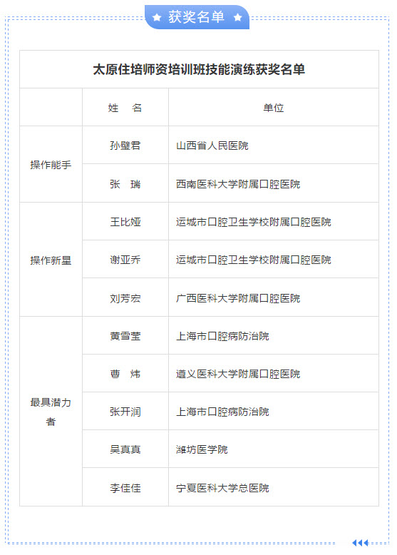 最后選出了操作能手獎、操作新星獎和最具潛力者獎。下午進行口腔醫(yī)師規(guī)范化培訓(xùn)教學(xué)及學(xué)習(xí)問題答疑,并發(fā)放證書。