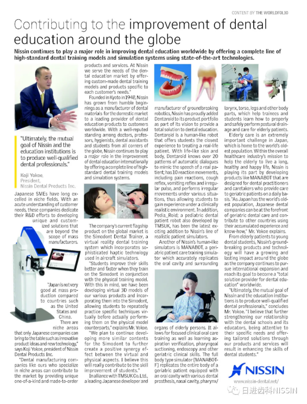 “ 與美國(guó)和中國(guó)等國(guó)家相比,日本不太擅長(zhǎng)大規(guī)模生產(chǎn),但有些利基領(lǐng)域只有日本公司才能拿得出手,比如創(chuàng)新的產(chǎn)品理念和新的技術(shù)。”Nissin公司總裁KojiYokoe說,“像我們這樣專注于細(xì)分領(lǐng)域的牙科制造公司可以通過提供獨(dú)一無二的、定制的產(chǎn)品和服務(wù)來為市場(chǎng)做出貢獻(xiàn)。在Nissin ,我們通過為每個(gè)特定客戶提供定制化的牙科培訓(xùn)模型和產(chǎn)品來滿足牙科教育市場(chǎng)的需求?!?/span>