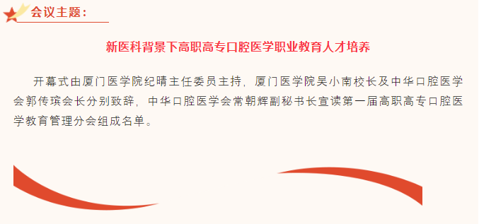 新跨越、新起航,由中華口腔醫(yī)學(xué)會(huì)高職高??谇会t(yī)學(xué)教育管理分會(huì)主辦、廈門醫(yī)學(xué)院承辦的中華口腔醫(yī)學(xué)會(huì)高職高??谇会t(yī)學(xué)教育管理分會(huì)第1次學(xué)術(shù)年會(huì)于2023年6月30-7月2日在福建省廈門市隆重舉辦。