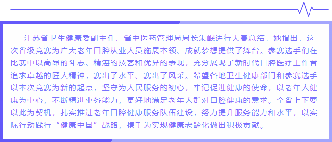 大賽旨在進(jìn)一步提高我省老年人口腔健康素養(yǎng),提升老年口腔健康服務(wù)水平,加強(qiáng)全省執(zhí)業(yè)醫(yī)師臨床診療能力和技能水平,為實(shí)現(xiàn)健康老齡化貢獻(xiàn)力量。省衛(wèi)生健康委副主任、省中醫(yī)藥管理局局長朱岷、省人力資源社會(huì)保障廳二級巡視員張斌峰、省疾控局副局長、省衛(wèi)生健康委老齡健康處處長吳偉、省人力資源社會(huì)保障廳職業(yè)能力建設(shè)處處長李建方、南京醫(yī)科大學(xué)附屬口腔醫(yī)院黨委書記徐艷、院長嚴(yán)斌、杭州醫(yī)學(xué)院副院長姬海蓮等領(lǐng)導(dǎo)、專家出席本次活動(dòng)。